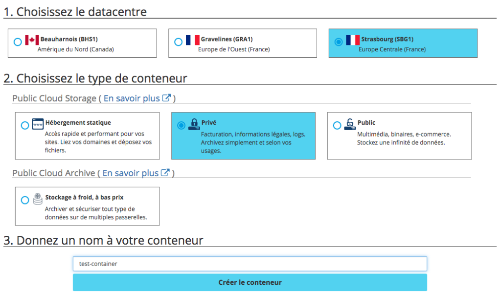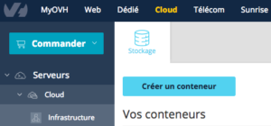 Ensuite on va sur le manager OVH, dans la partie Cloud, on demande la création d’un container via l’item Stockage. C’est ce container qui stockera les données.